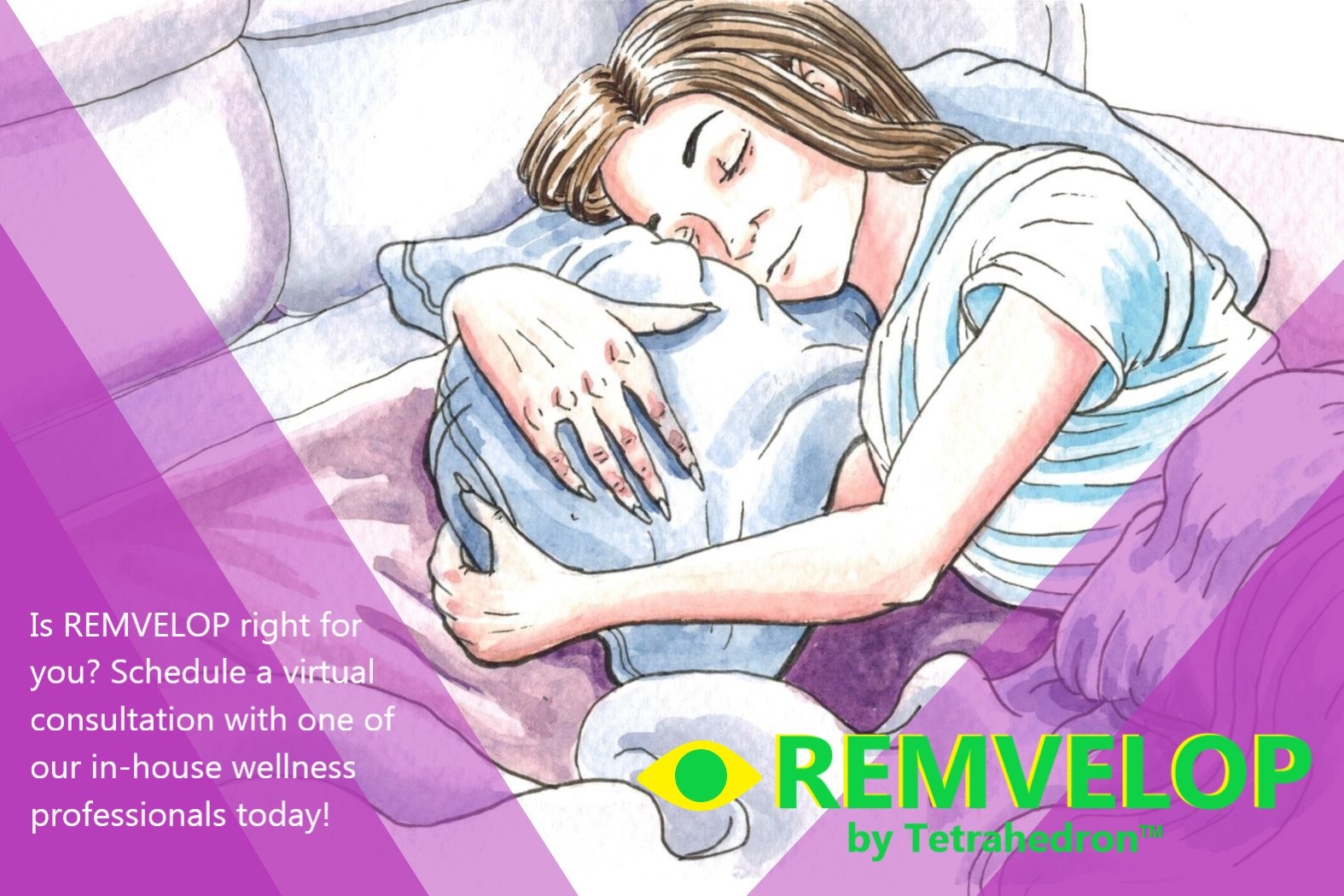 REMVELOP is a fast-acting sleep supplement developed by the Tetrahedron Corporation. REMVELOP relaxes your muscles with all-natural biosignals and calms your brain with soothing frequencies, guiding you into a rest state ideal for rejuvenating REM sleep. One 15mg pill is guaranteed to bring you 7 hours of deep, invigorating sleep.